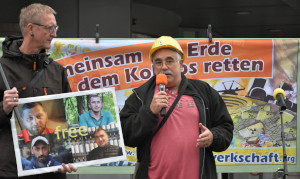 Wir, rund 40 Teilnehmer, bei der Aktion am Internationalen Umweltkampftag in Duisburg, haben von der Verhaftung von vier eurer Bergleute erfahren. Anlass ist euer Streik für den Erhalt eurer Arbeitsplätze und der Kampf gegen den umweltzerstörerischen Tagebau.